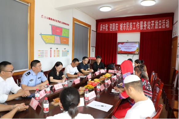 9月26日,东台镇新坝社区开展“庆中秋、迎国庆”城市民族工作服务站开放日活动。市委统战部副部长、市民宗局局长吴红平,市公安局政保大队长陈志宏等参加活动。