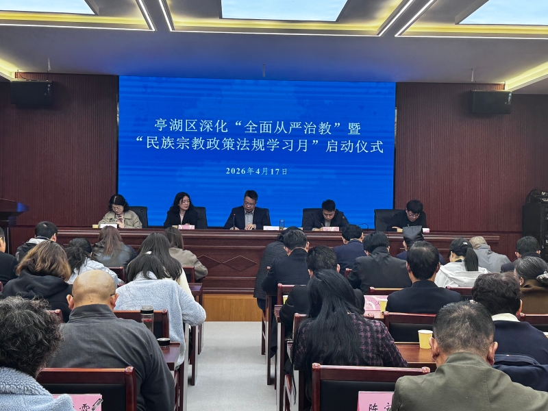 4月17日下午,亭湖区深化“全面从严治教”工作例会暨“民族宗教政策法规学习月”启动仪式在基督教中国化亭湖实践馆会议室举行。会议深入学习贯彻全国两会精神及上级关于宗教工作的决策部署,总结一季度工作,分析当前形势,部署下一阶段重点任务。区委统战部副部长、区民宗局局长徐江出席会议并讲话。